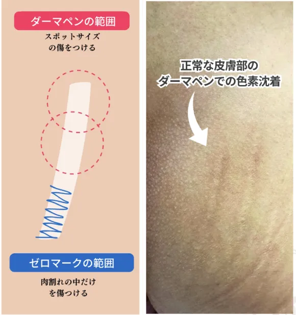 ゼロマークは専用のマシンを用いて表皮に無数の傷をつけ、妊娠線に唯一の効果が認められている『レジストリル』配合の”特殊成分(セラム)”を真皮層へ浸透させます。